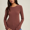 Experience ultimate comfort with this essential espresso long sleeve. Its fitted ribbed knit design and round neckline make it perfect for pairing with jeans, skirts, or layering under your favorite outfits. Crafted from a soft blend of 65% rayon, 30% polyester, and 5% spandex, it offers a flattering fit you'll love wearing every day.